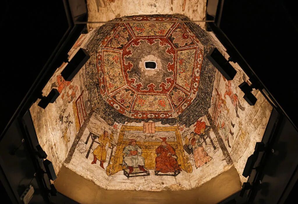 ▲2025年12月15日,陕西考古博物馆“文物保护篇”展厅展示的渭南市蒲城县洞耳村元代壁画墓文物。视觉中国丨图