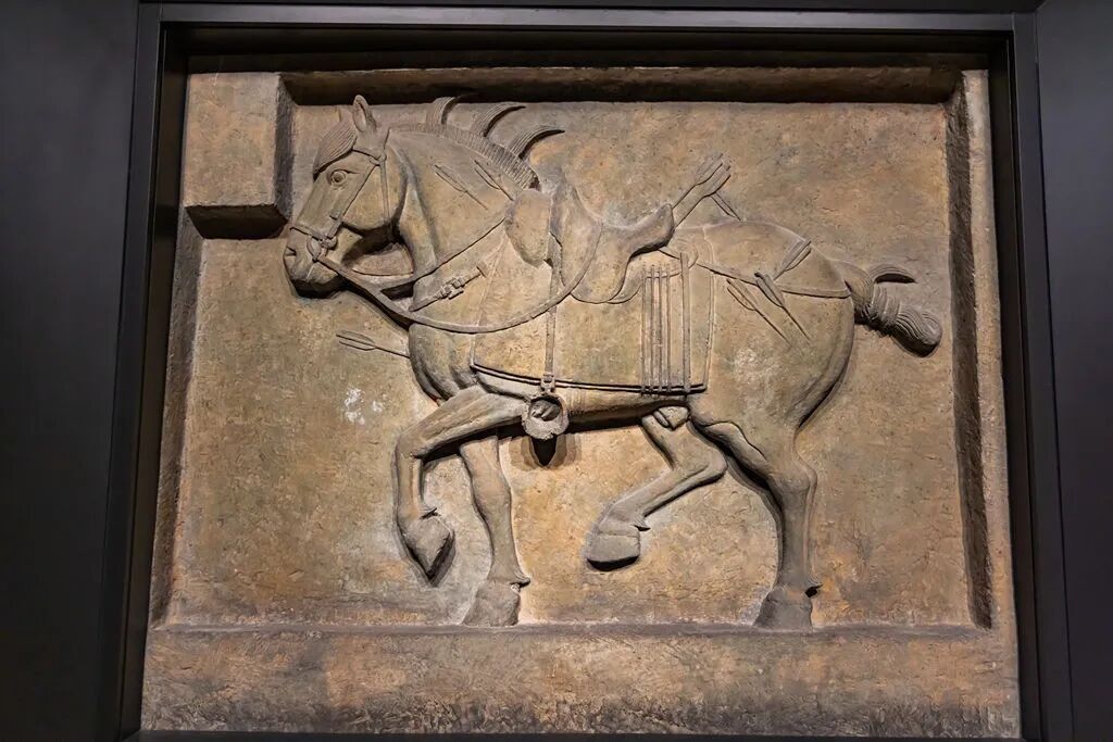 ▲2025年11月,西安碑林博物馆“昭陵六骏专题展”,其中“四骏”为原件,飒露紫和图中的拳毛騧为复制件,原件现藏于美国宾夕法尼亚大学考古学及人类学博物馆。视觉中国丨图